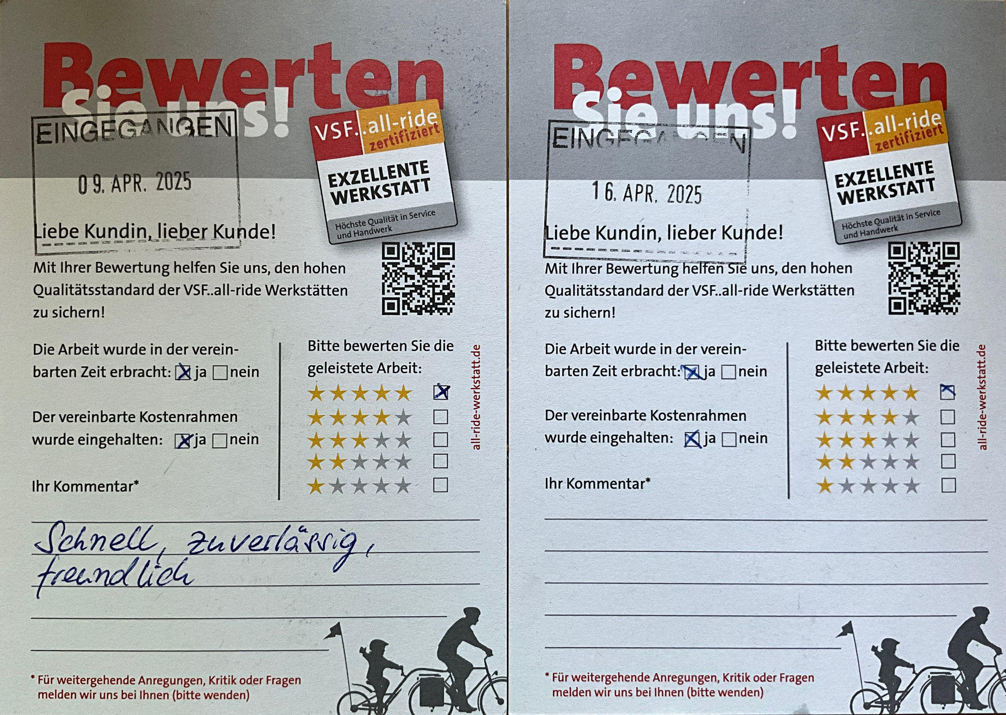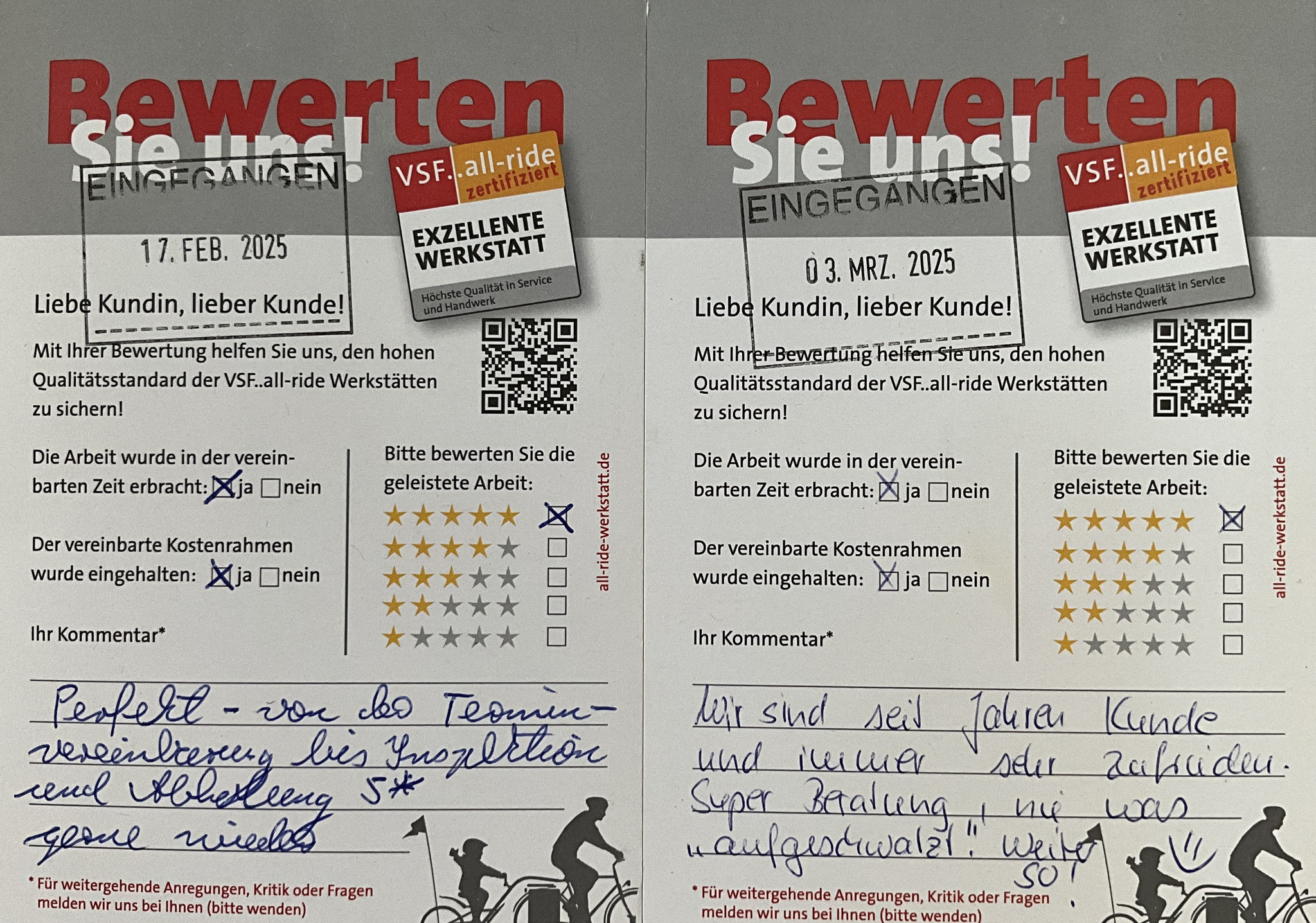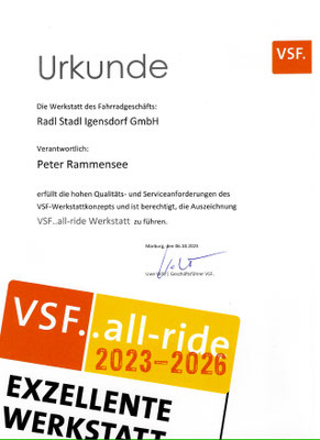 Mit dem vom unabhängigen Brachenverband VSF in die Welt gerufenen Siegel "VSF..all-ride Werkstatt" sind nur solche Werkstätten ausgezeichnet, die einen umfangreichen Kriterienkatalog erfüllen. Dazu gehören eine gleichbleibend hohe Werkstattqualität, Transparenz, Zuverlässigkeit und ein verbindlicher Leistungsrahmen gegenüber dem Kunden.